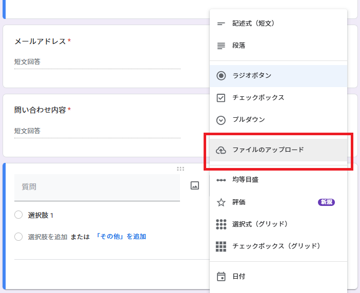 • 「回答形式の選択」からファイルアップロードを選ぶ